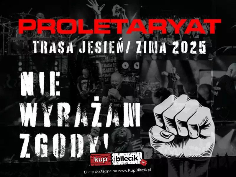 bilety: To nie jest zwykła trasa koncertowa - to manifest przeciwko wojnie, przeciwko masakrom cywilów, przeciwko hipokryzji światowych przywódców. Zespół, który od prawie 40 lat nigdy nie płynął z prądem i zawsze dosadnie komentował rzeczywistość i od zawsze śpiewał o tym, o czym ludzie myśleli, ale już nie mieli odwagi powiedzieć. Proletaryat artyści: Tomasz Olejnik, Dariusz Kacprzak, Robert Hajduk, Wiktor DaraszkiewiczProletaryat - polski zespół rockowy z Pabianic. Proletaryat to absolutna legenda polskiej sceny rockowej. Od samego początku poruszając się w estetyce crossover, łączyli perfekcyjnie punk, hard core i metal. Kiedy dodamy do tego, mocne, zaangażowane i bardzo bezpośrednie teksty, łatwo znaleźć odpowiedź z czego wynika ta trwająca do dziś fascynacja zespołem. Po ponad trzydziestu pięciu latach na scenie, zespół dopracował swój unikalny, wymykający się porównaniom styl. Bilety do nabycia na: KupBilecik.pl |